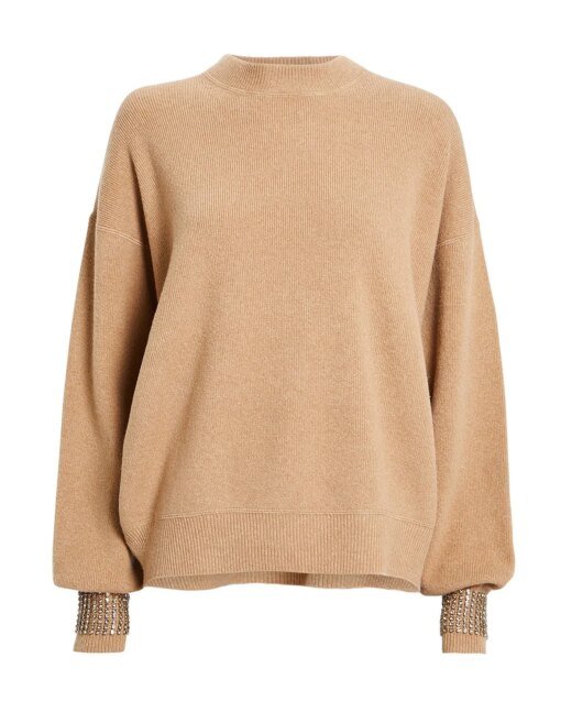 Alexander Wang effortlessly mixes classic elegance with NYC downtown cool in this black wool blend crystal embellished sweater featuring a ribbed collar, long sleeves, a ribbed hem and cuffs and crystal embellished cuffs.