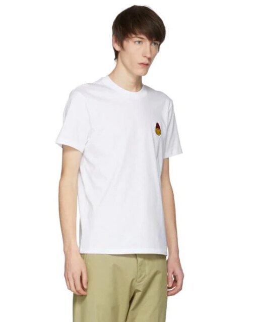 Short sleeve cotton jersey t-shirt in white. Rib knit crewneck collar. Multicolor logo graphic applique at chest. Tonal logo embroidered at back. Tonal stitching. Part of the AMI Alexandre Mattiussi x Smiley collaboration.