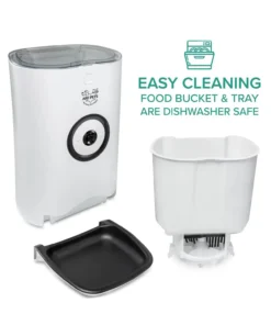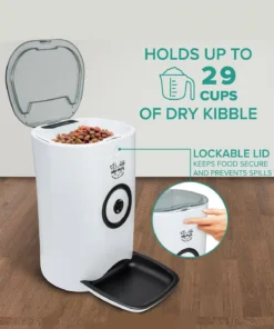 - The interior chamber can hold 20 cups of dry food. When it’s time to eat, the impeller rotates to release the food down the chute and into the feeding tray for your pet!