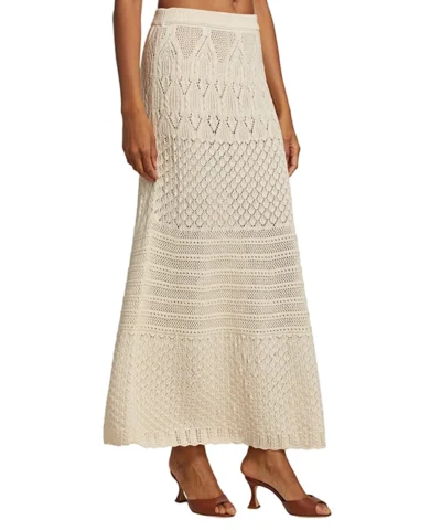 The JENA skirt by ba&sh echoes Saint-Tropez in the 70s. This maxi skirt has elasticated ribbed trim at the waist so you can wear it as a short dress. Knitted with a mix of pointelle, openwork and cable for a variety of textures. The perfect knitted skirt for summer wear.