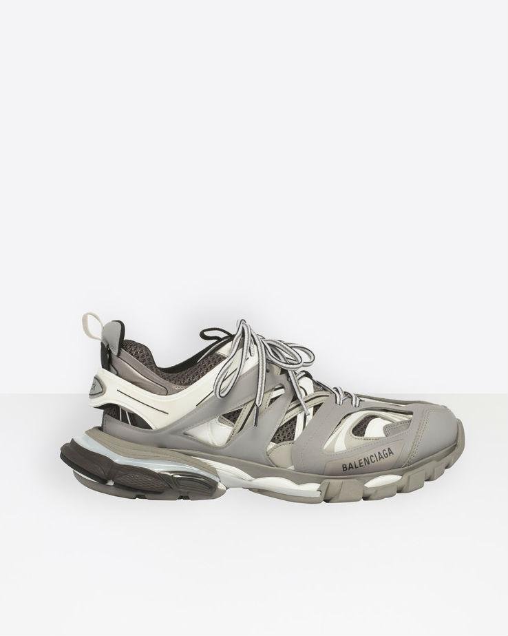 - A new sports shoe silhouette released for the AW18 collection, Balenciaga’s ‘Track’ sneakers are the pair of the moment. Paying homage to chunky trainers of the 90s, these texturised black sneakers from Balenciaga feature a ridged rubber sole, a branded insole, a round toe, a lace-up front fastening and a logo patch at the tongue.