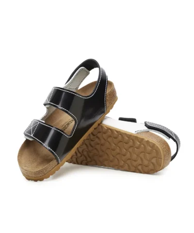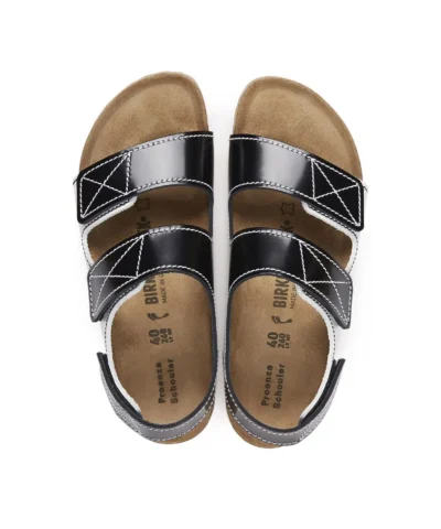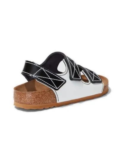 Made in collaboration with Birkenstock, the classic Milano three-strap sandals are reimagined in smooth black and white specchio leather with contrast black and white topstitching. Designed with Velcro straps and a molded cork footbed.