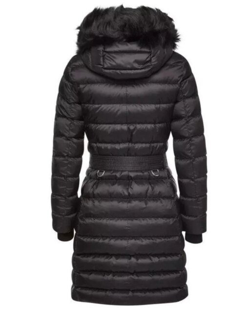 Burberry Limehouse Shearling-Trim Padded Coat. Reminiscing on the brand heritage, the traditional Burberry check was showcased on oversized bags, turned up coat cuffs and baseball caps, and on the half lining of this black puffed mid-length zip front hooded coat featuring a fur trimmed hood, long sleeves, a zip front fastening and a belted waist.