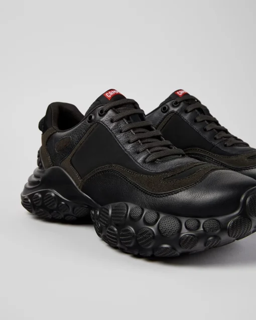 Black textile/leather men’s sneakers with lace closures, recycled OrthoLite® footbeds, and XL EXTRALIGHT® EVA outsoles.
