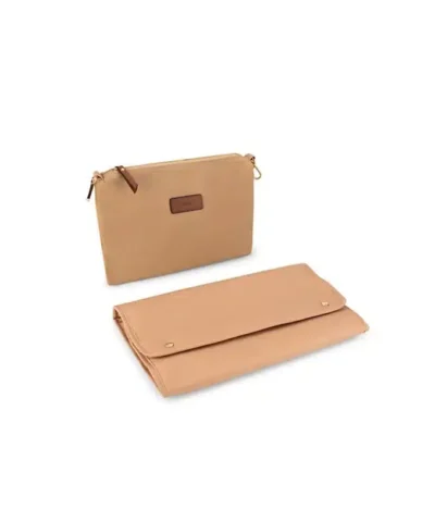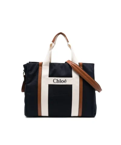 A canvas changing bag features calf leather handles, a Chloé logo grosgrain braid, and buggy clips including a Chloé pouch and a changing mat.