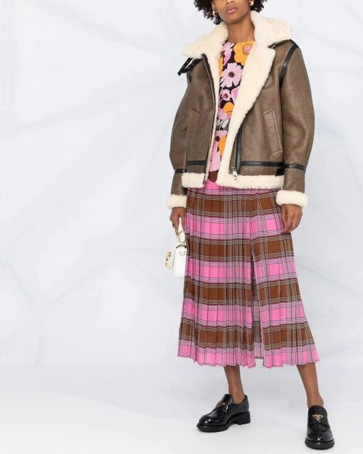 Made from sumptuous shearling, this authentic lambskin hooded aviator jacket reveals an aged patina effect. The slightly shiny finish is contrasted with black leather trims for a sporty allure. The Chloé logo is subtly embossed on the back yoke.