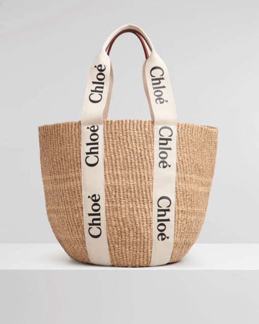 Crafted in a timeless basket shape for an effortless summer mood, this large Woody basket is hand-woven from partly upcycled materials by independent craftswomen in Kenya. Echoing the Maison’s Woody mule, the line’s Chloé logo ribbon details the natural fiber for graphic contrast and a signature touch. The bottom of the basket is protected by a Chloé-embossed round leather patch for durability.