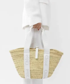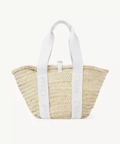 Medium basket in handbraided raffia, smooth calfskin & Chloé logo embroidery