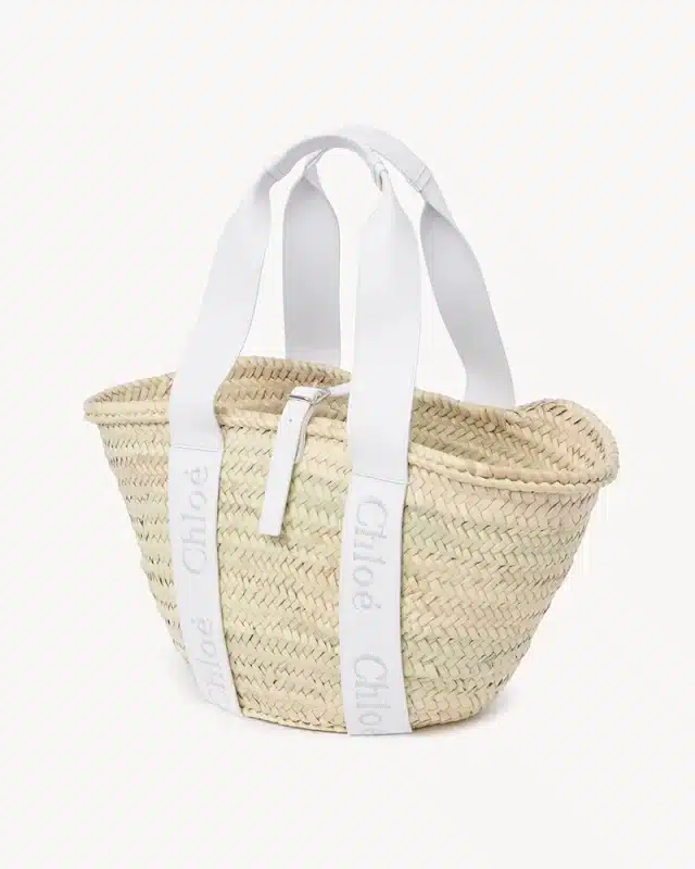 Medium basket in handbraided raffia, smooth calfskin & Chloé logo embroidery