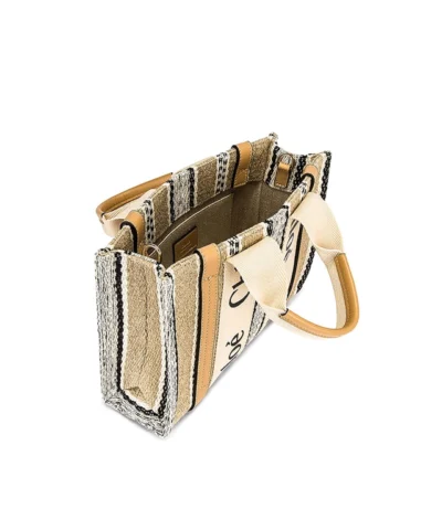 Crafted from graphic striped linen and shiny calfskin, this medium Woody tote bag is a spacious day-to-evening bag. The roomy inside compartment is unlined and includes a practical flat pocket in leather for an elevated touch.