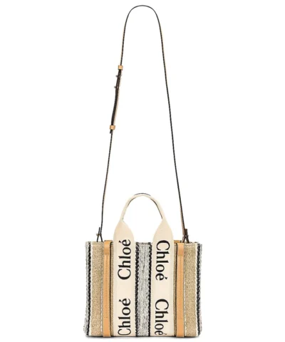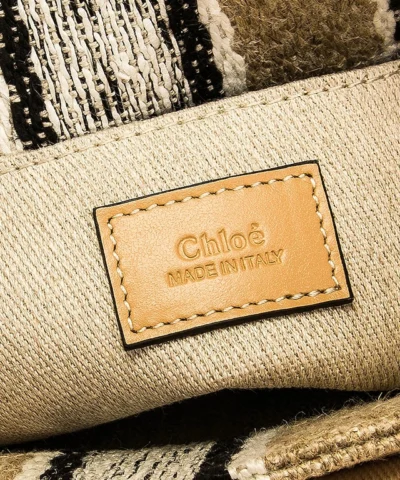 The bag’s sharp, modern lines are emphasized by the contrasting vertical leather strips and the signature Chloé logo ribbon carried over from the Maison’s Woody mule. Carry this tote bag comfortably on the shoulder or in hand.