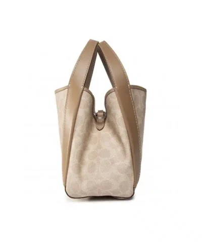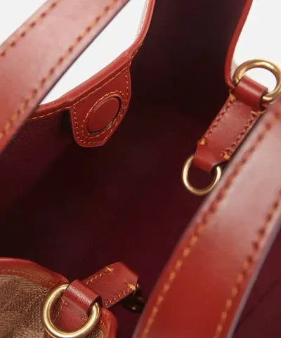 Coach’s ‘Hadley’ bag features luxurious faux leather craftsmanship and a spacious inside. Metal feet at the bottom offer stability. Opening the bag reveals an inner zip-fastening pocket, while the main bag features magnetic closure. The bag is finished with a branded luggage tag and signature branded lettering throughout.