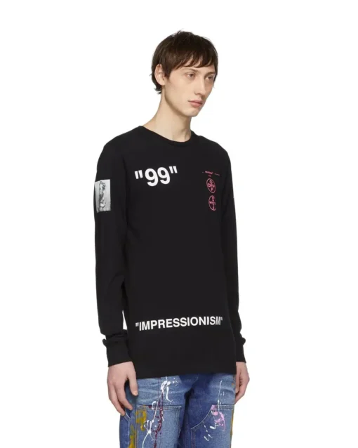 Long sleeve cotton jersey t-shirt in black. Rib knit crewneck collar and cuffs. Logo and text printed in white and pink at front. Logo, text, and graphic printed in pink and tones of grey at sleeves and back. Tonal stitching.