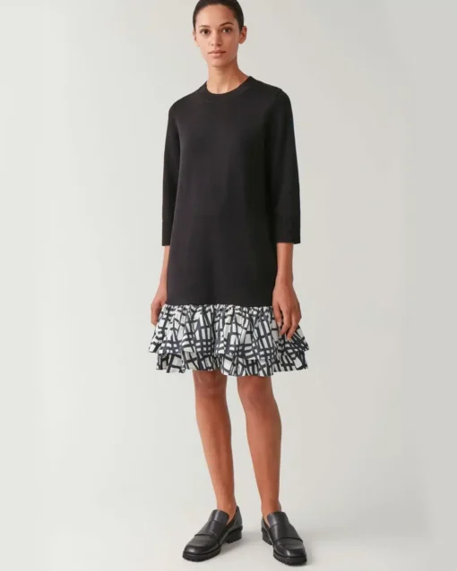 This round-neck dress is made from pure organic-cotton with a fine knitted quality. A straight fit, it has wide ribbed edges and a double-layer pleated panel at the hem in a statement monochrome check.
