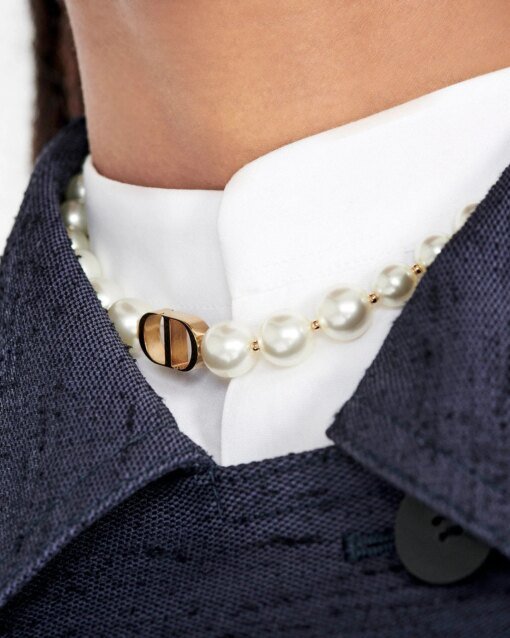 Dior rediscovers its origins and heritage in the 30 Montaigne collection. While keeping its timeless and elegant look, the resin pearl necklace is reimagined with a modern design. White and mini gold-tone resin pearls and a ‘CD’ signature wrap delicately around the neck.
