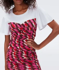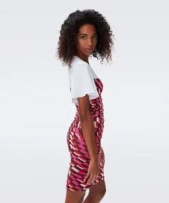The DVF Annalise mini dress combines a sweetheart neckline mini dress with t-shirt sleeves for a layered look. A form-fitting piece, this mesh dress has flattering ruching throughout and short ruffle sleeves in a contrasting jersey.