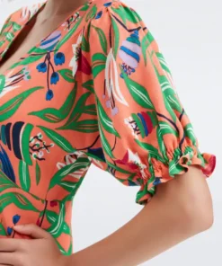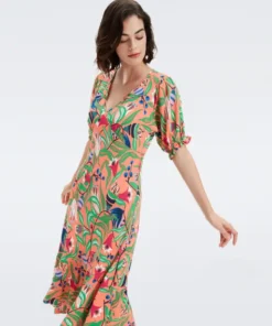 Made with smooth crepe, the Orla is soft and light. With no waistband, this knee-length dress has a loose, comfortable fit and a V-neckline. Its puffed sleeves are slightly cinched and ruffled, just like its large hem that moves with you.
