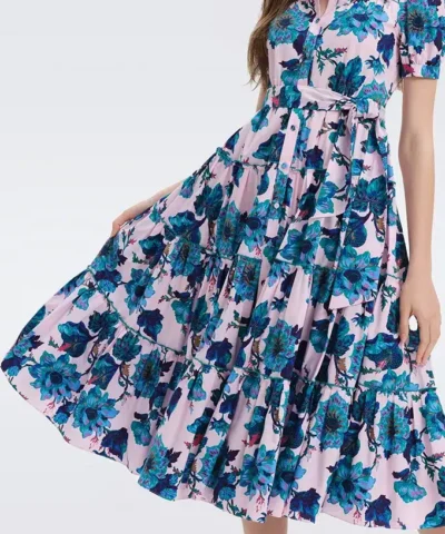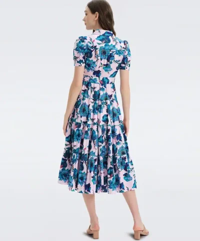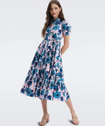 Easy-going yet elevated, the DVF Queena dress is a button-up midi made from a soft, light cotton. Billowy in fit, it has short puffed sleeves and fabric buttons from its collar to its hem. A tied belt accentuates the waist and flows into an A-line skirt, creating a lighthearted, feminine silhouette.