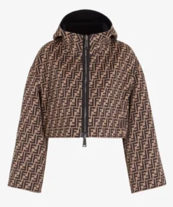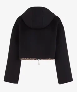 Reversible cropped, hooded jacket with patch pockets and wide, low-cut, set-in sleeves. Zip fastening with double slider. Made of black double-sided wool fabric. Tone-on-tone leather pockets. Lining customized with all-over FF motif.