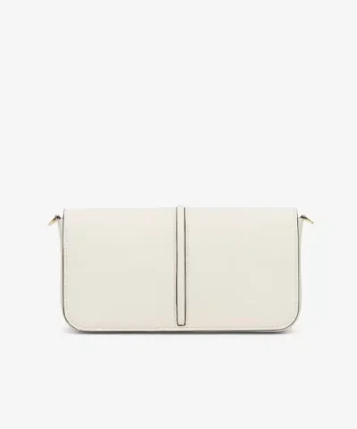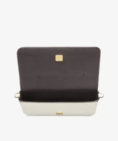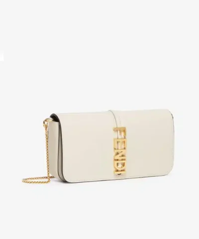 Compact Fendigraphy wallet with flap and metal Fendi lettering. Featuring an internal, removable pouch with eight card slots and zipper pocket. Fine chain shoulder strap, detachable. Made of white leather. Gold-finish metalware.