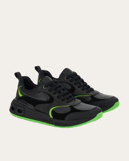 Dynamism and texture with iconic details bring this nineties inspired sneaker to life. The leather upper features suede inserts and a bold contrasting swirl that matches the tread. Double Gancio on the side of the heel.