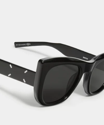 The MM008 01 sunglasses feature a bold cat-eye silhouette structured from black acetate. The sides are adorned with real threaded details of Maison Margiela’s iconic four white stitches, and the tip of the inner left temple is embellished with the Maison Margiela’s numeric logo with 8 encircled.