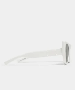 The MM008 W2 sunglasses feature a bold cat-eye silhouette structured from white acetate. The sides are adorned with real threaded details of Maison Margiela’s iconic four white stitches, and the tip of the inner left temple is embellished with the Maison Margiela’s numeric logo with 8 encircled.