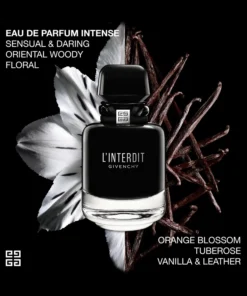 Givenchy L’Interdit Eau de Parfum Intense is a woody floral perfume with a warm & spicy embrace. This addictive fragrance has notes of orange blossom giving way to a bold heart of tuberose, leathered vanilla, and roasted sesame. A blend of vetiver and patchouli leaves an intoxicating thrill.