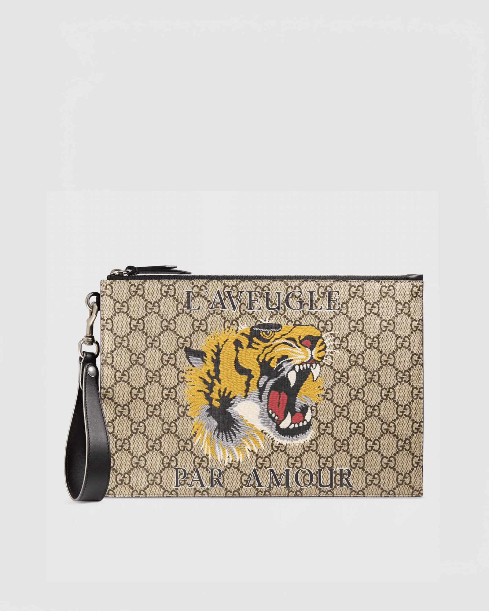 Each season the GG motif is enriched with new prints and motifs. The tiger-a symbol that has become synonymous with the House-is printed at the centre of a slim pouch made in GG Supreme canvas, a material with low environmental impact. The phrase “L’Aveugle Par Amour”, translating to “Blind for Love”, frames the image.