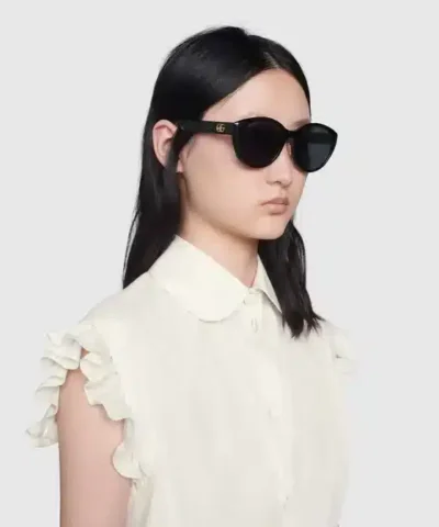 These acetate sunglasses feature a feminine cat-eye shape, Gucci’s signature “GG” hinge design, and a temple design inspired by Gucci’s leather goods. With acetate nose pads, these frames are a great fit for medium to wide faces, including those with a low nose bridge.