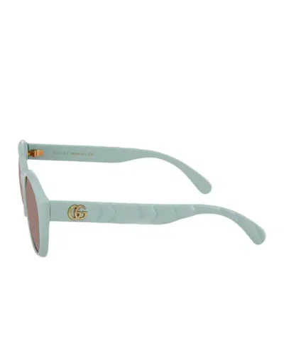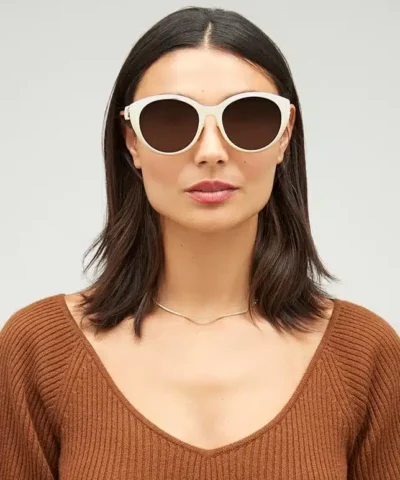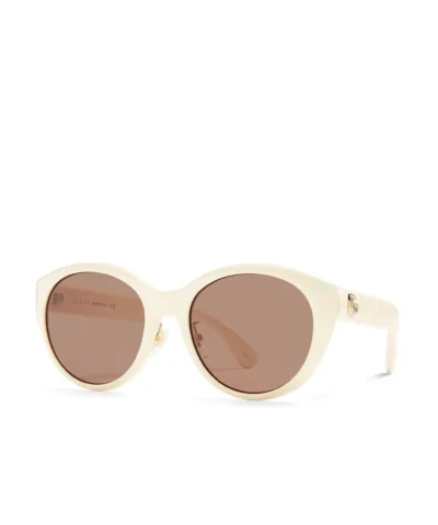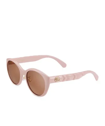 These acetate sunglasses feature a feminine cat-eye shape, Gucci’s signature “GG” hinge design, and a temple design inspired by Gucci’s leather goods. With acetate nose pads, these frames are a great fit for medium to wide faces, including those with a low nose bridge.