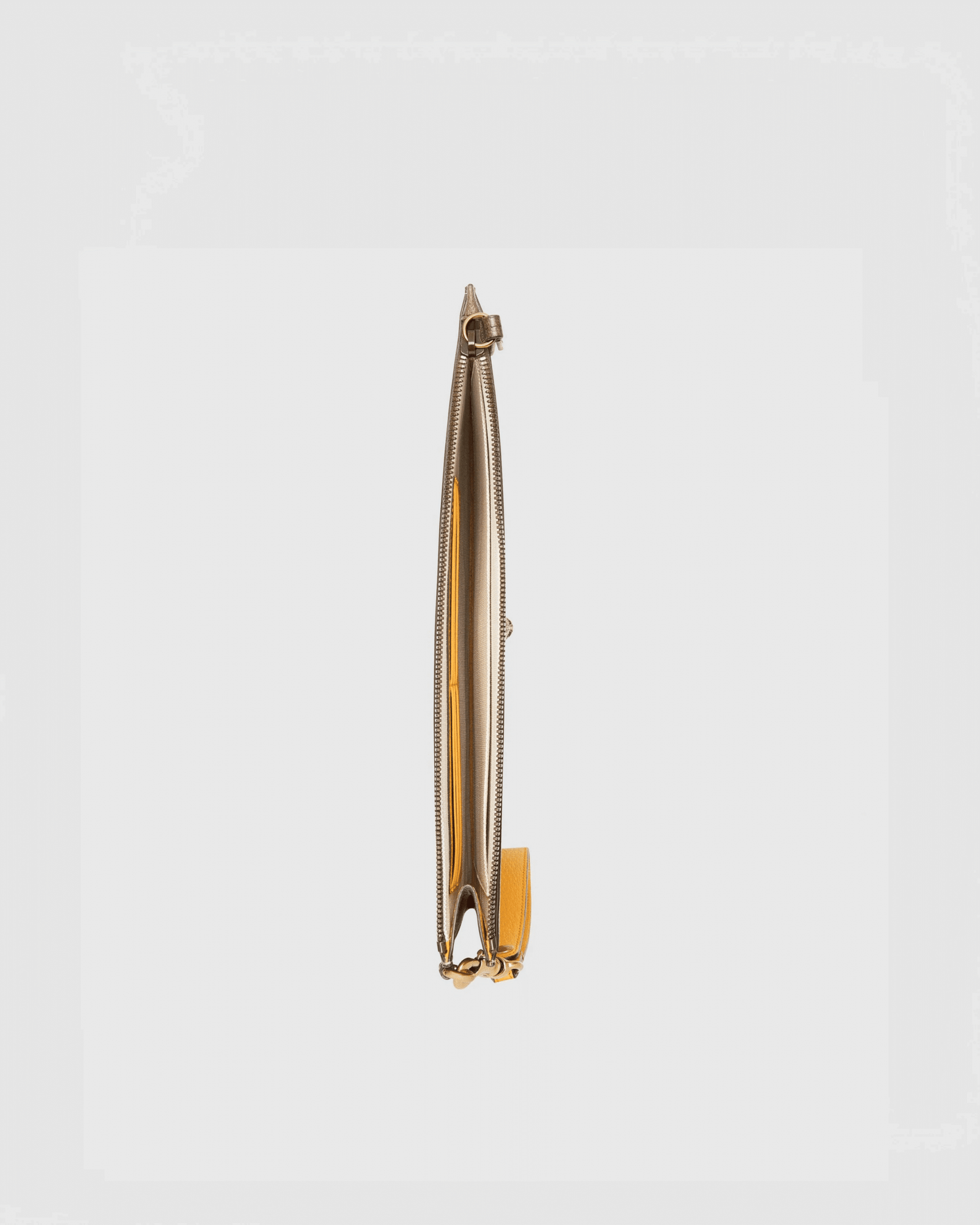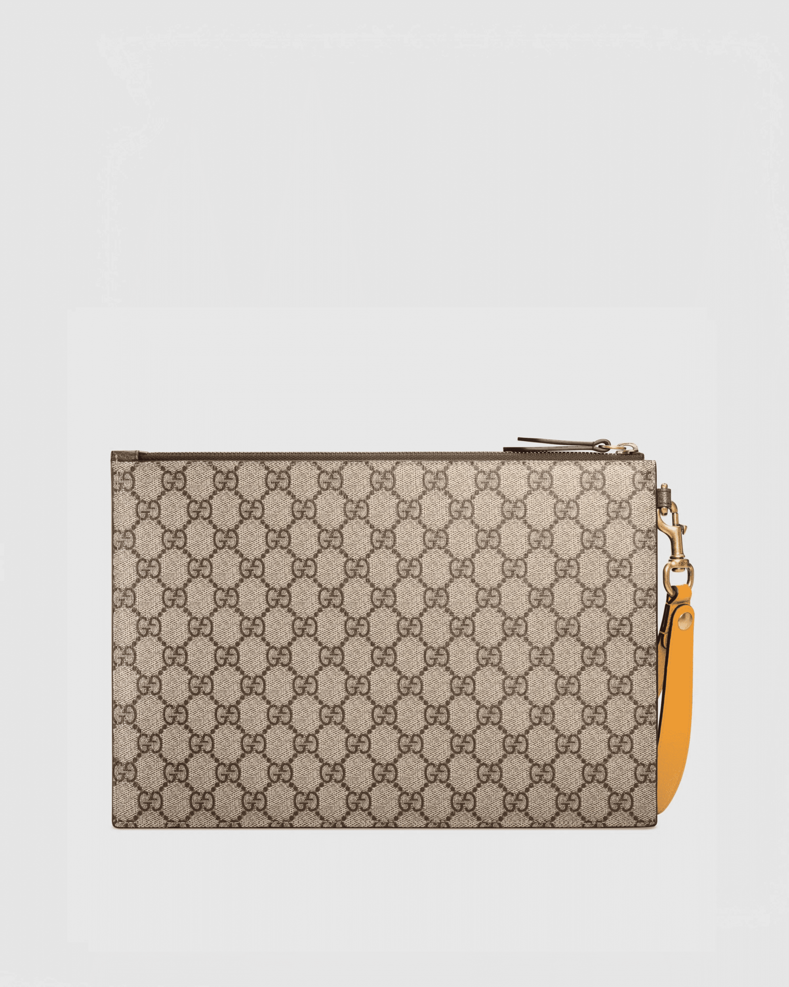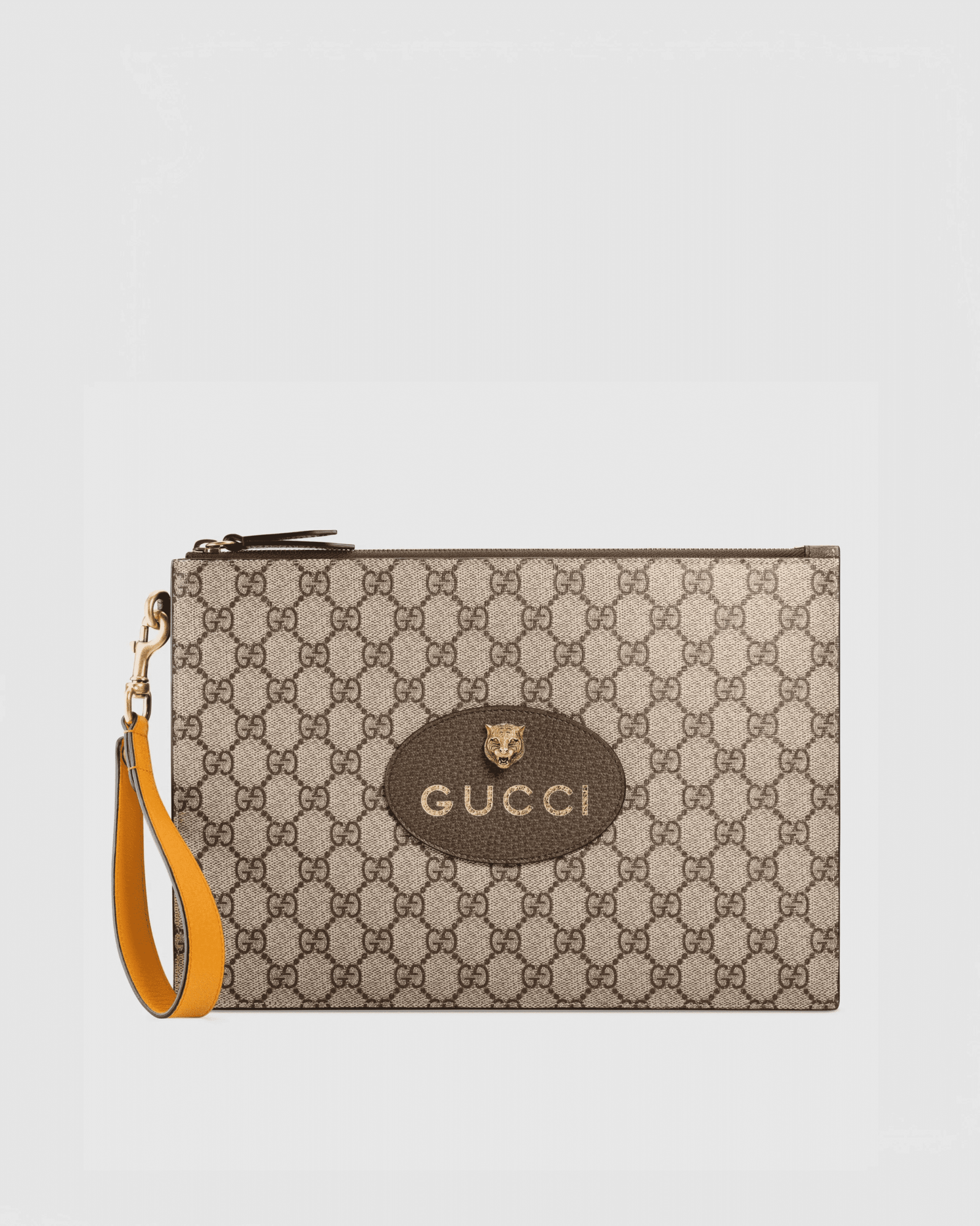 A collection of vintage inspired leather accessories in GG Supreme feature an oval leather tag with metal feline head. The removable wrist strap of this slim pouch is in yellow leather.