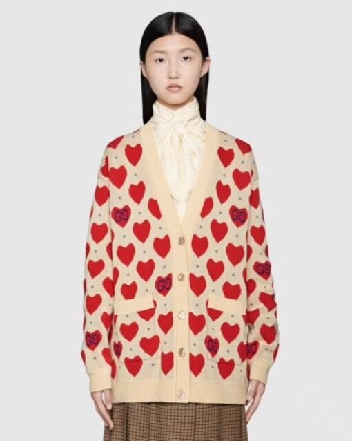 A contemporary House code, colorful hearts combine with Guccio Gucci’s monogram atop this jacquard cardigan. Each season, logo details evolve in new ways, reimagined through Gucci’s whimsical lens.