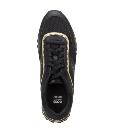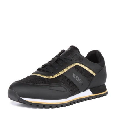 A sporty trainer by BOSS for your footwear collection. Coming in a black colourway constructed from a mix of suede, leather and mesh uppers it is an intricate design. Completed with gold stripe detailing and signature BOSS branding throughout, they are a standout shoe that will fit perfectly into your casual footwear collection.