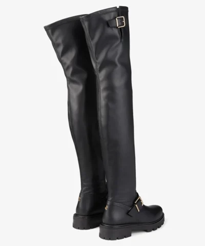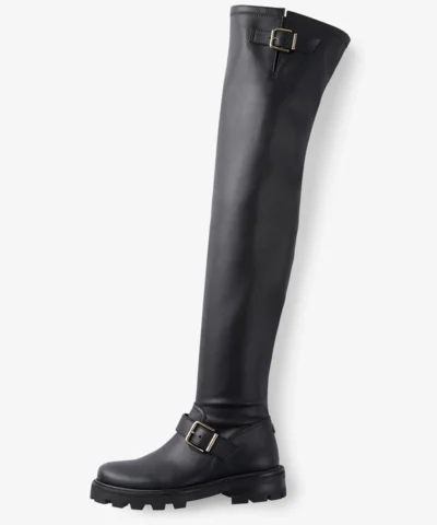 Update your capsule off-duty wardrobe with our black stretch bonded fabric knee-high ankle boots. Presented with a timeless round-toe shape, they feature silver-tone metal buckles and are set on sturdy chunky rubber tread soles that ensure optimum traction. Let them imbue everyday looks with edge