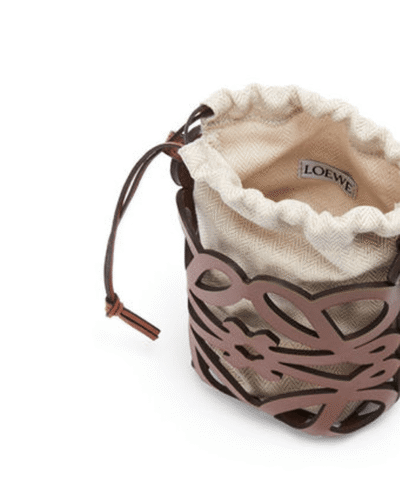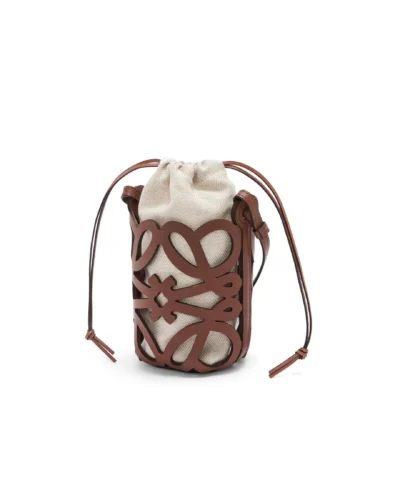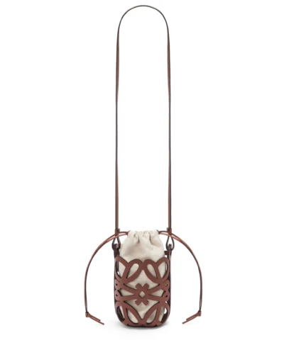Versatile pocket crafted in cut-out calfskin in an Anagram pattern with a calfskin strap and a drawstring inner pouch in herringbone cotton canvas.