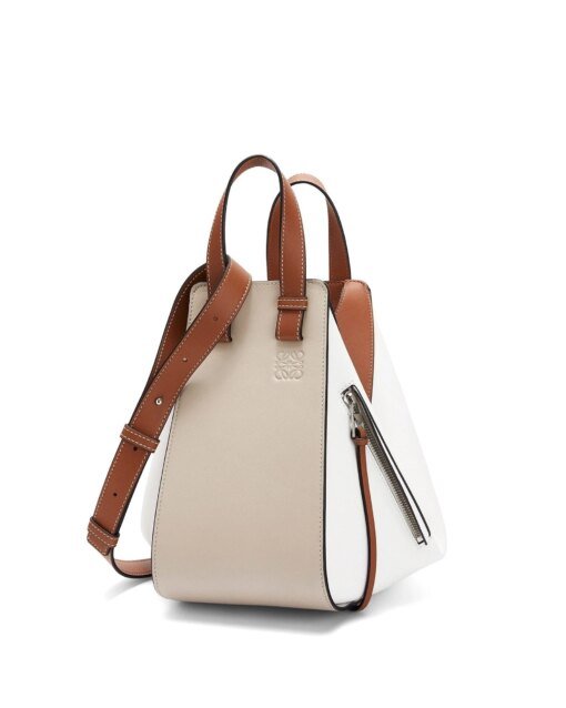 Cream and brown ‘Hammock’ shoulder bag from Loewe. Size small. Made of leather. Embellished with embossed logo. Features external zip pocket, two half-round handles, a detachable and adjustable shoulder strap, silver-tone metal hardware interior with one compartment and two slip pockets inside.