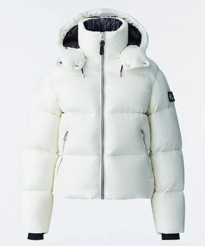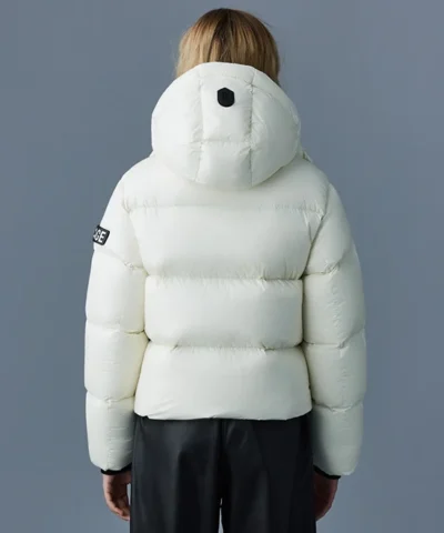EVIE is a recycled nano down jacket for women with a removable storm visor hood and high-sheen shell. Tailored to an oversized drop shoulder silhouette, generous padding, and contrast lining retain heat. A modern cut with high performance, a winter staple with statement scale.