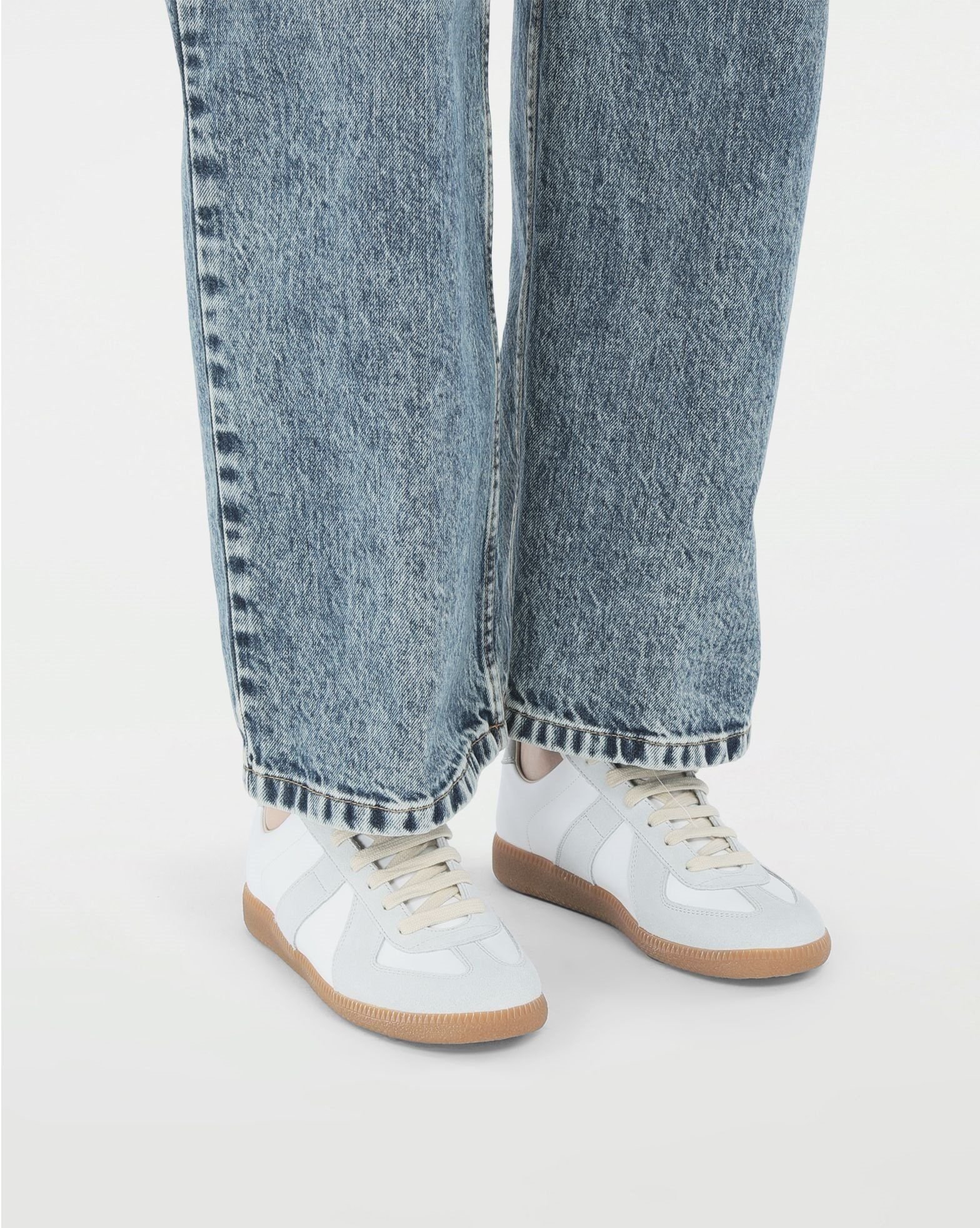 Replica sneakers inspired by men’s sports shoes from the Austrian provenance in the seventies – part of the Maison’s iconic Line 22. Low-top pair come in a leather and suede rendition with rubber soles. The back is marked with the Maison’s iconic white straight stitch. Made in Italy.