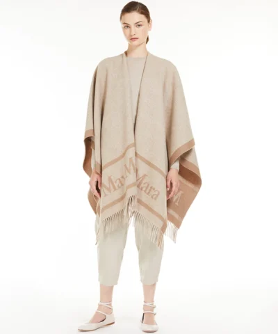 - Wide, enveloping cape, inspired by the classic Max Mara stoles, made of exquisite yarn-dyed pure wool yarn, with a jacquard Max Mara motif on the edges, front and back. Edge with long fringes.