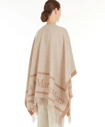 - Wide, enveloping cape, inspired by the classic Max Mara stoles, made of exquisite yarn-dyed pure wool yarn, with a jacquard Max Mara motif on the edges, front and back. Edge with long fringes.