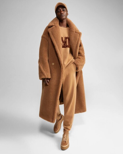 Flaunted by the stars and photographed in fashion magazines with its oversize, cocoon-like shape, the exclusive Teddy by Max Mara has managed to outdo every classic fashion must-have. The iconic Max Mara Teddy has managed to rise to the top of every fashion must-have list. Oversized coat with a soft texture made from camel and silk, featuring a lapel collar, dropped-shoulder sleeves and horizontal welt pockets at the sides.