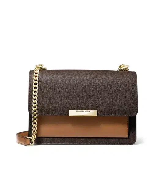 Perfect for transitioning between day and night, the Jade Large Crossbody Bag is a standout that is sure to be a wardrobe favorite. Crafted in logo print coated canvas and smooth leather, the bag features flap top with snap close, back slip pocket, two compartments with center divider zip pocket, internal slip pocket, pocket under flap, chain and leather shoulder strap, and gold tone hardware. Dust bag included.