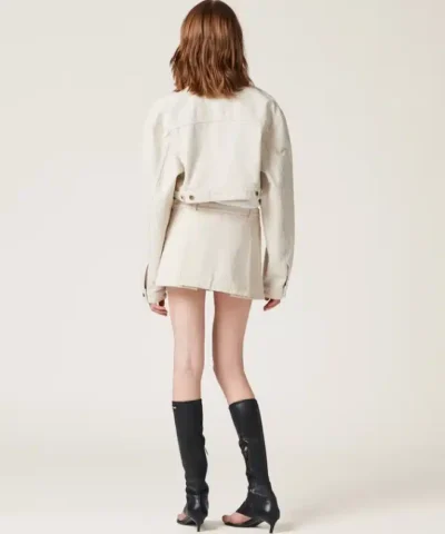 • The timeless style of denim meets Miu Miu’s charismatic personality in this new jacket. Typical details of the denim world, such as the top-stitching and the flap pockets on the chest with buttons that echo the other buttons on the garment, stand out on the relaxed, sleek lines. The tonal embroidered logo completes the jacket with a discreet yet distinctive signature touch.
