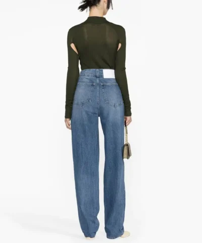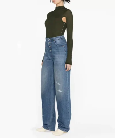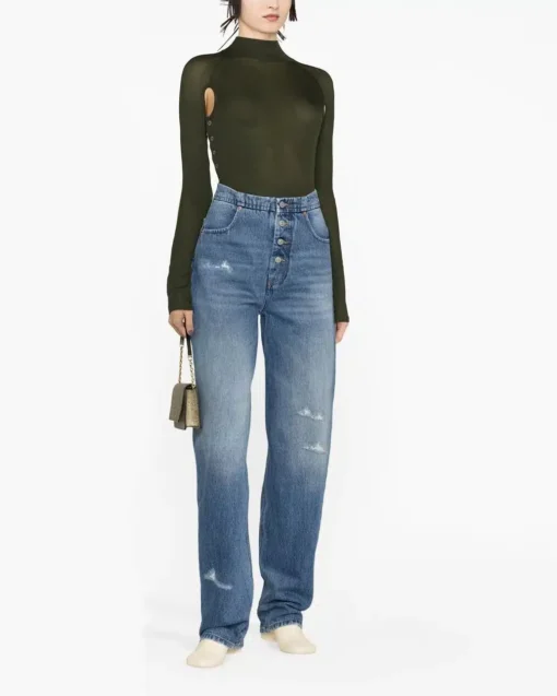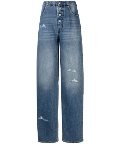 Distressed-effect denim jeans from MM6 Maison Margiela featuring blue, cotton, distressed effect, ripped detailing, high waist, front button and zip fastening, belt loops, two rounded pockets to the sides, straight leg, logo patch to the rear and two rear patch pockets.