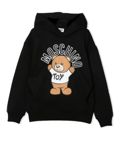 Teddy Bear graphic hoodie from MOSCHINO KIDS featuring black, cotton, teddy bear print, round neck, drop shoulder and long sleeves.