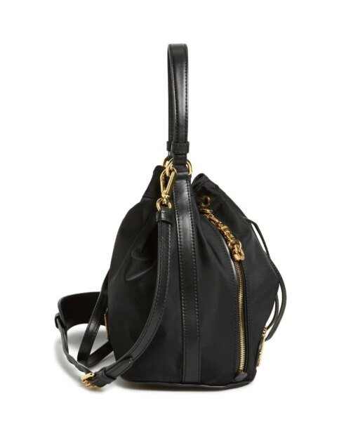 Gleaming goldtone hardware and bold logo letters perfectly complement a drawstring-cinched bucket bag detailed with vertical side-zip pockets.