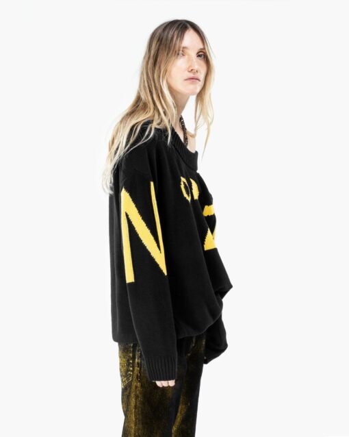BLACK COTTON-BLEND SWEATER WITH RIBBED OFF-SHOULDER NECKLINE. YELLOW INTARSIA LOGO. OVERSIZED FIT.
