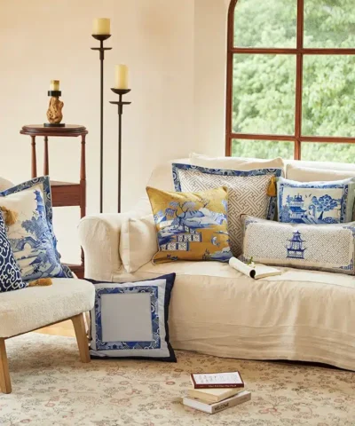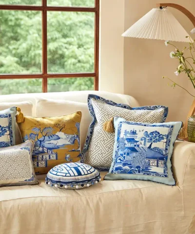 This duchesse cotton cushion reflects Blue and White Porcelain Pattern 20″ x 20″ Pillow. One side is the artistic conception of ” Misty Rain Jiangnan” in the ancient Chinese style picture. and the other side is a beautiful blue and white fret pattern. a sensorial journey for the mind, where scents, sounds, and sensations give life to delicate, familiar aesthetics.