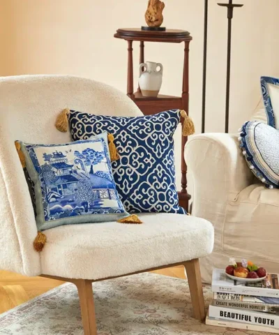 This duchesse cotton cushion reflects Blue and White Porcelain Pattern 20″ x 20″ Pillow. One side is the artistic conception of ” Pavilions ” in the ancient Chinese style picture. and the other side is a beautiful blue and white fret pattern. a sensorial journey for the mind, where scents, sounds, and sensations give life to delicate, familiar aesthetics.